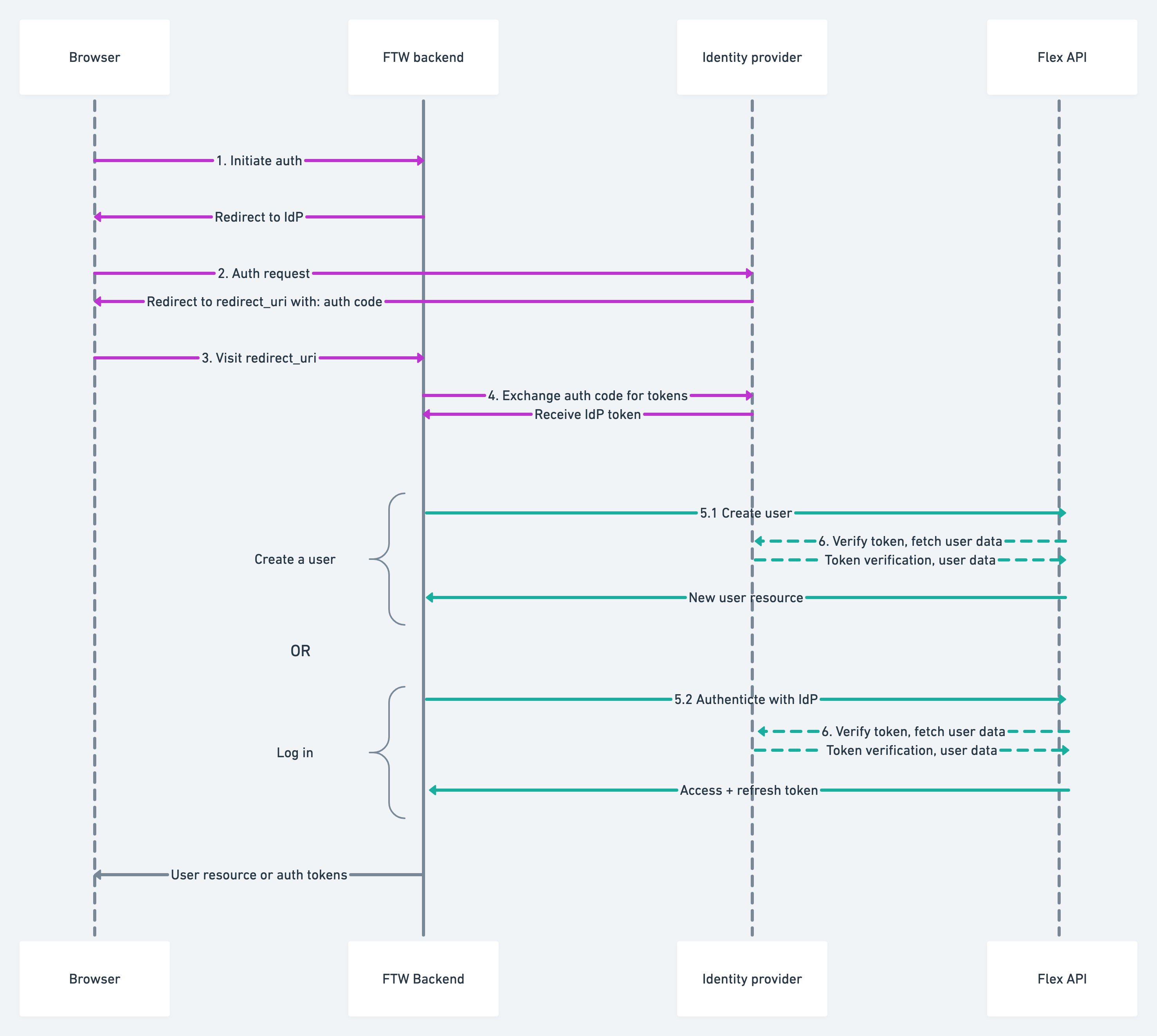 1.-4. This is standard OAuth2/OpenID Connect login flow. This part may differ depending on the identity provider that is being used but the flow is usually like this: user is redirected to the identity provider to provide their credentials, an authorization code is returned, which is traded to a token with a request to the identity provider from the FTW backend. What token is obtained depends on the identity provider and protocol in use.