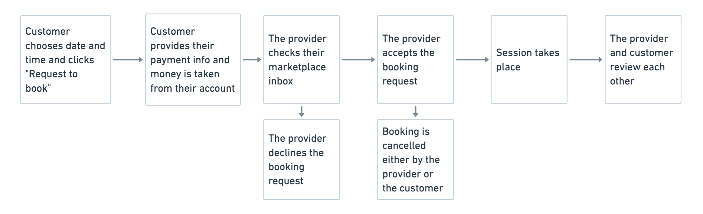 The transaction page is visible to the customer and provider after a booking request. It shows the current status of the transaction - whether the booking is requested, accepted, declined, or expired. The customer and provider can also message. The transaction page can be accessed from the user's Inbox.