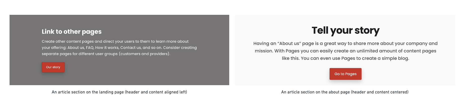 Let’s lay out a more concrete example of the scenario outlined in the previous paragraph: say you want to define that all Sections on the landing page that use the template section-article, the title and ingress should be aligned left, and on all other pages they should adhere to the default styling, i.e. be centred: