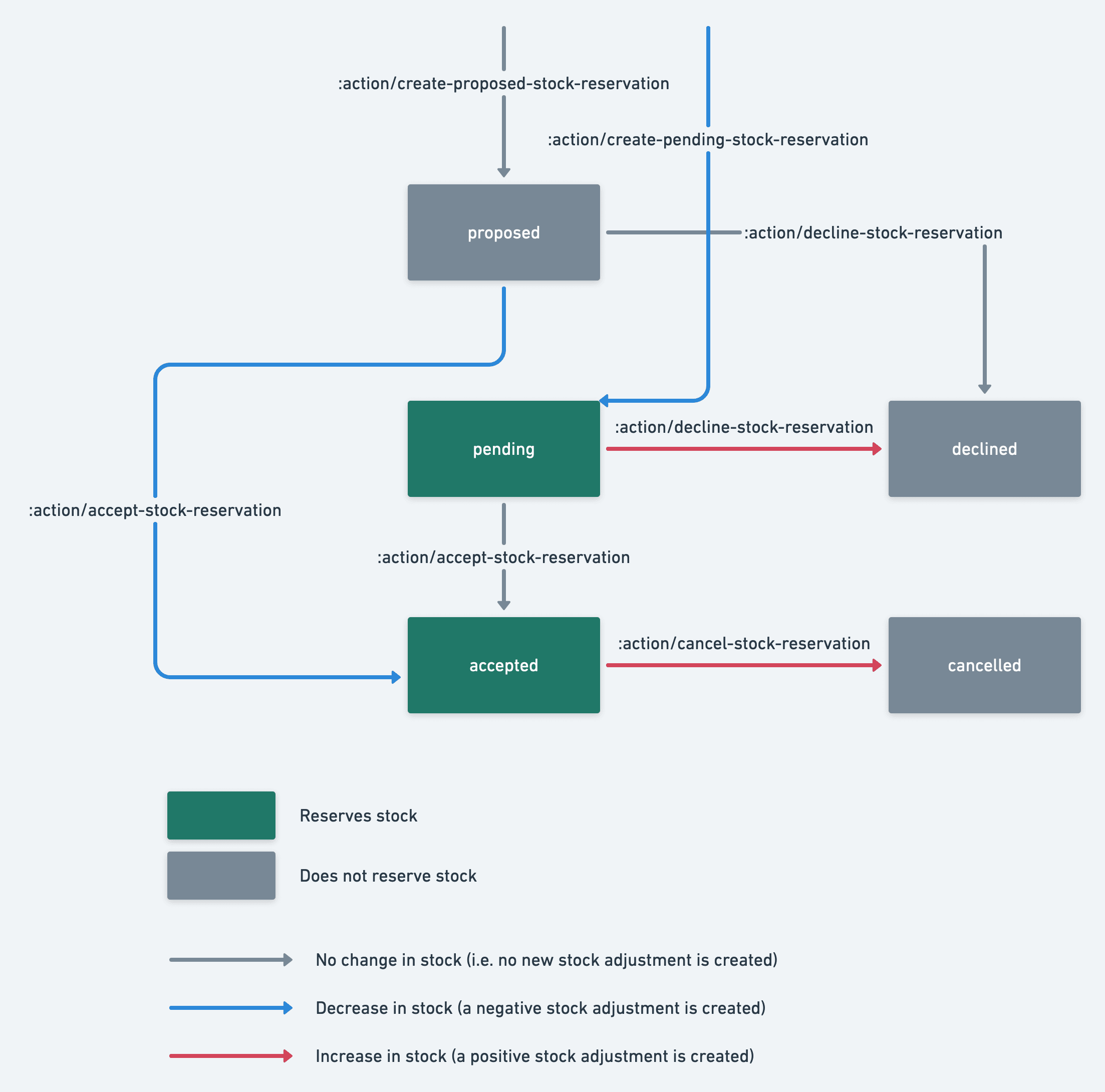 The figure below illustrates the possible stock reservation states, transitions between the states and the corresponding actions that you can use in your transaction process.